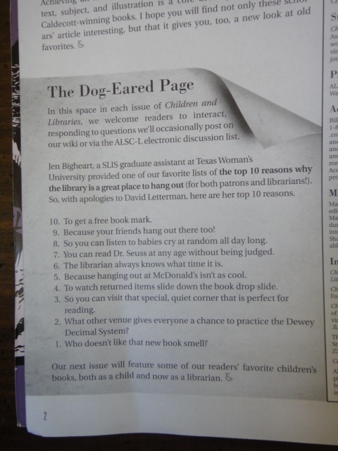 Children & Libraries: the Journal of the Association for Library Service to Children! I was jumping up and down! Even though this isn't ground breaking youth programming, I am so excited to be a very small part in this wonderful journal and association. All youth librarians should become members too ALSC. Here is my feature: